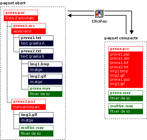 Tal com vam veure a l'inici del curs, els paquets Clic es poden presentar en dos formats diferents: els paquets oberts (extensió PAC) i els compactes (extensió PCC). La diferència fonamental entre els dos tipus de paquets es dóna en el tipus d'informació que resideix dins dels fitxers: els PAC contenen només referències a les activitats (podríem dir que són com la "llista de la compra"), mentre que els PCC contenen dintre seu la major part dels ingredients necessaris per a fer-les funcionar (seguint l'analogia anterior, serien l'equivalent al "cistell amb la compra"). Els fitxers multimèdia no es poden posar mai dins del "cistell" i han de quedar com a elements independents a la carpeta de treball.